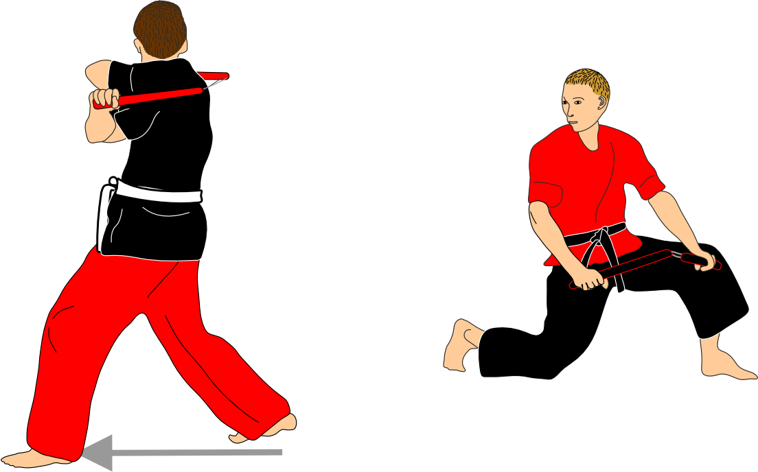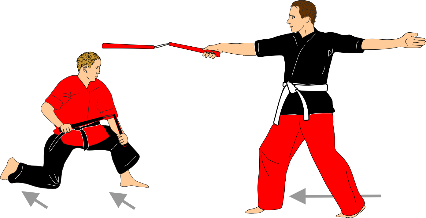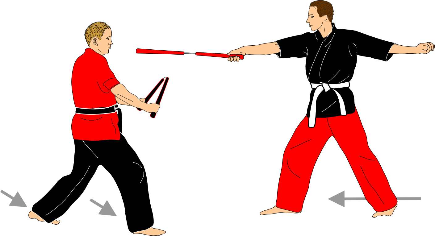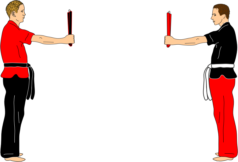 Each sequence begins with the attacker initiating an attack solely to assess distance. After this action, the attacker always recovers the nunchaku to the same guard position. This phase is intentionally repetitive and serves as a study of distance, timing, and precision with the nunchaku.