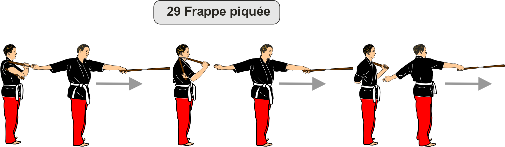 Strike 29 ends on the right: Reverse lateral strike, stance: à l’épauleSalute: Saluez