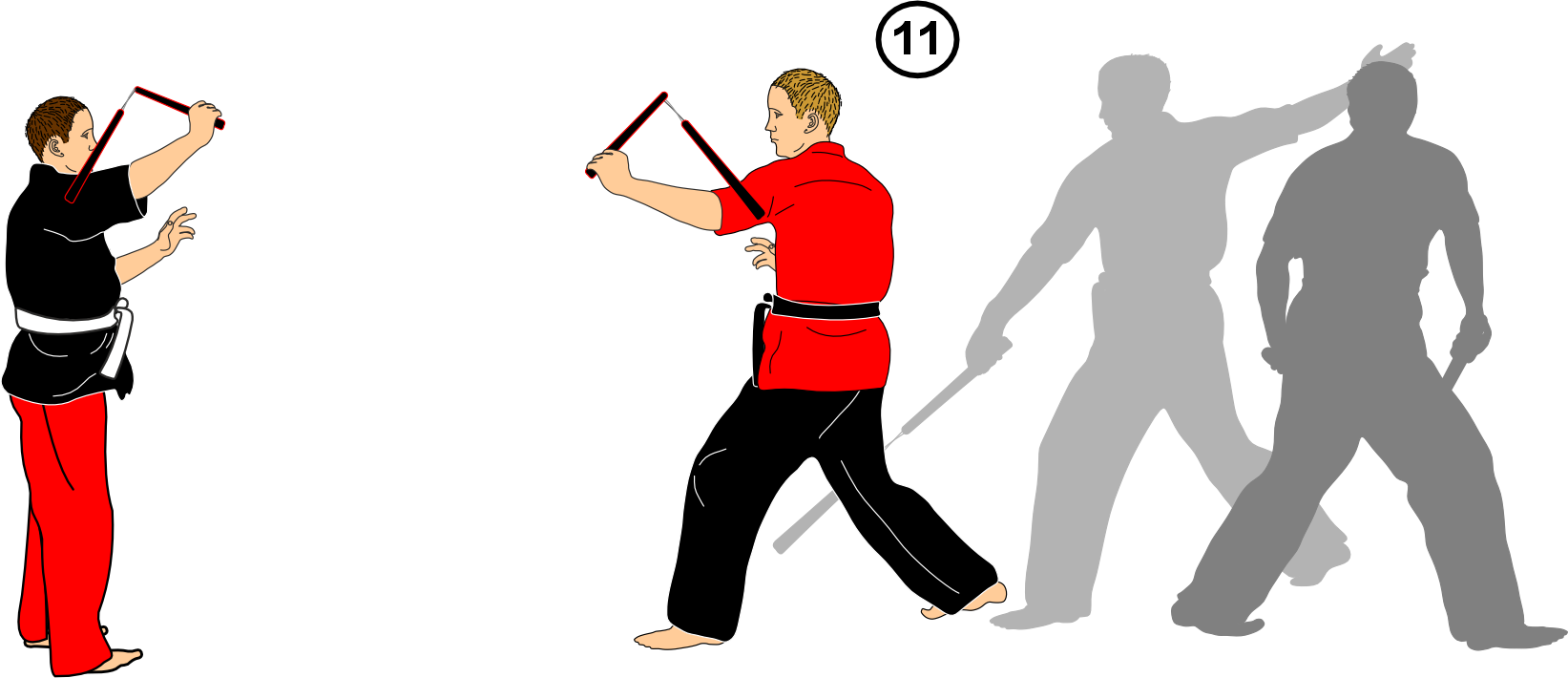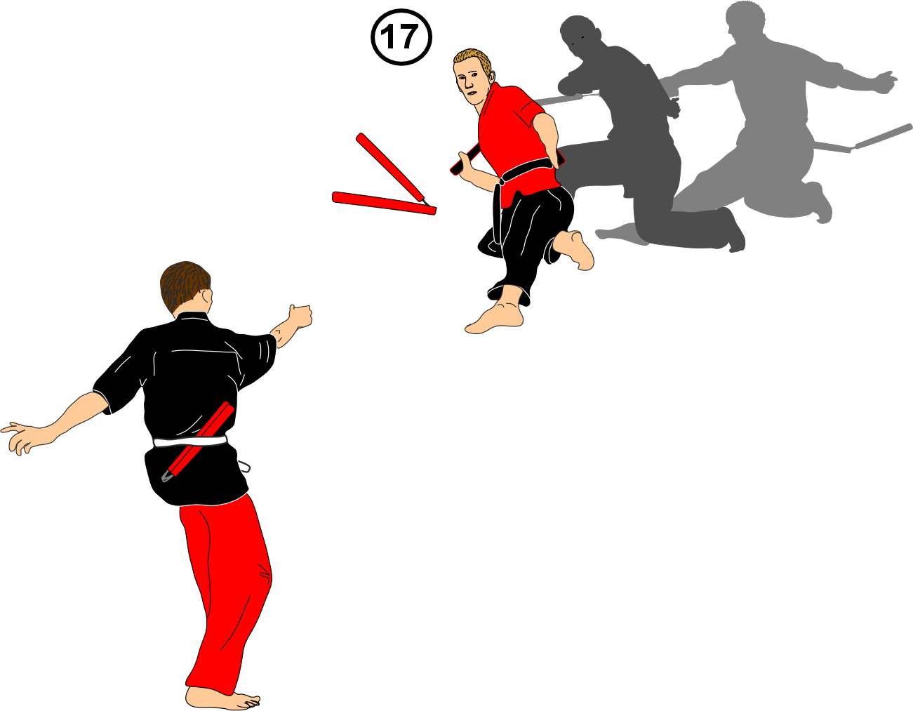 17. He throws a nunchaku at you; you evade or dive away while turning.
