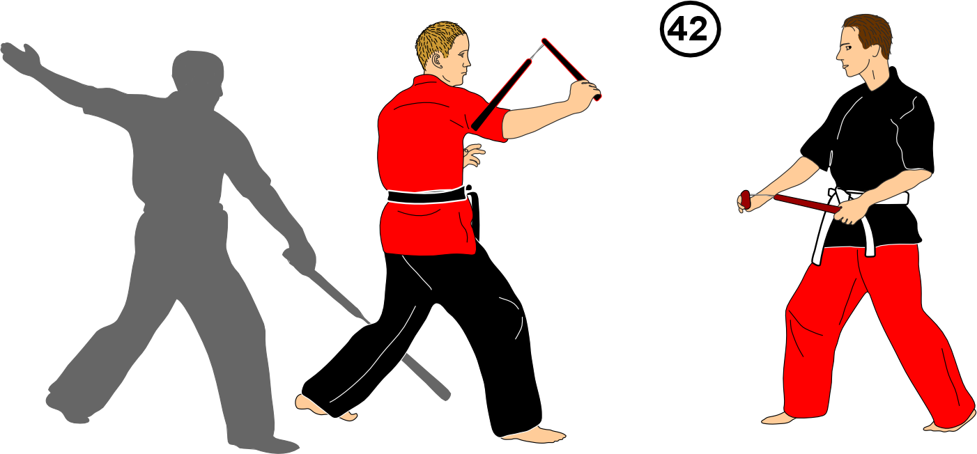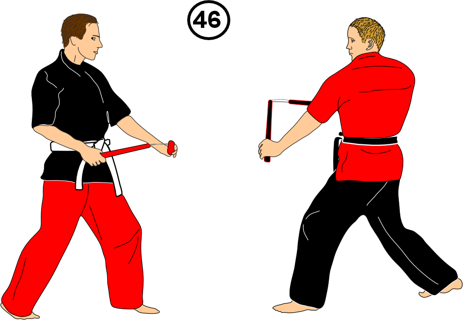 48. He attacks low; you strike low and parry or block his attack with your own nunchaku.