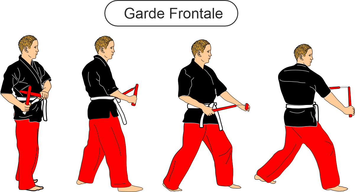 Frontal Guard is a neutral defensive stance or fighting position in which the body is oriented frontally toward the opponent.This guard provides a balanced foundation from which both offensive and defensive actions can be executed effectively. Due to its symmetrical structure, the practitioner maintains optimal control over balance, distance and mobility. The Frontal Guard allows smooth transitions between attack, defense and repositioning, and is often used as a starting or recovery position within nunchaku combat.